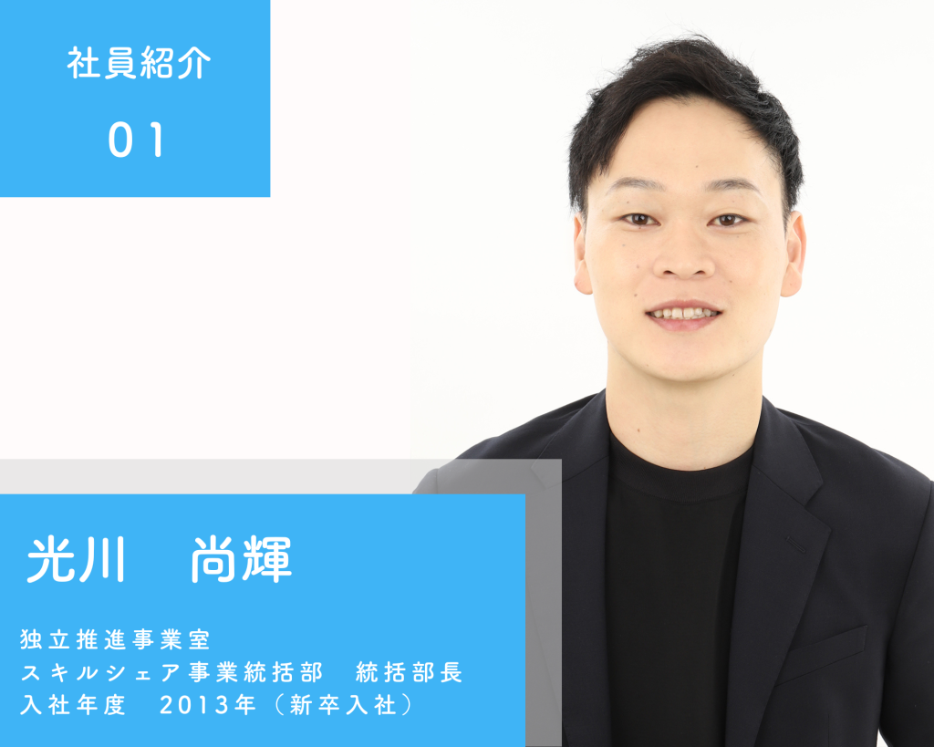 トップバッターは、2013年入社の光川尚輝さんです!就職事業部でご活躍後、現在は、2020年にスタートしたフリーランス・副業人材と企業のマッチングサービス「スキイキ」を牽引されています。