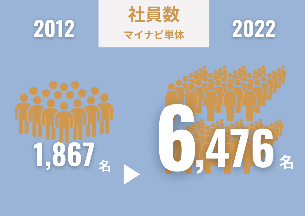 まずは社員数。マイナビ単体だけで3.5倍、グループ全体では5倍に増え、1万人に届く勢いです。2009年のリーマンショックの影響から、2010年のマイナビ新卒採用はそれまでの採用実績と比較すると、かなり減少しました。そこからわずか数年後には新卒採用・中途採用が活発になり、瞬く間に社員数が増えていきました。この期間に在籍していた方は、マイナビが大きな組織になっていく様子を体感していたことでしょう。