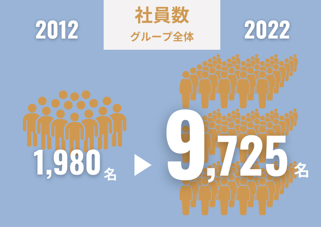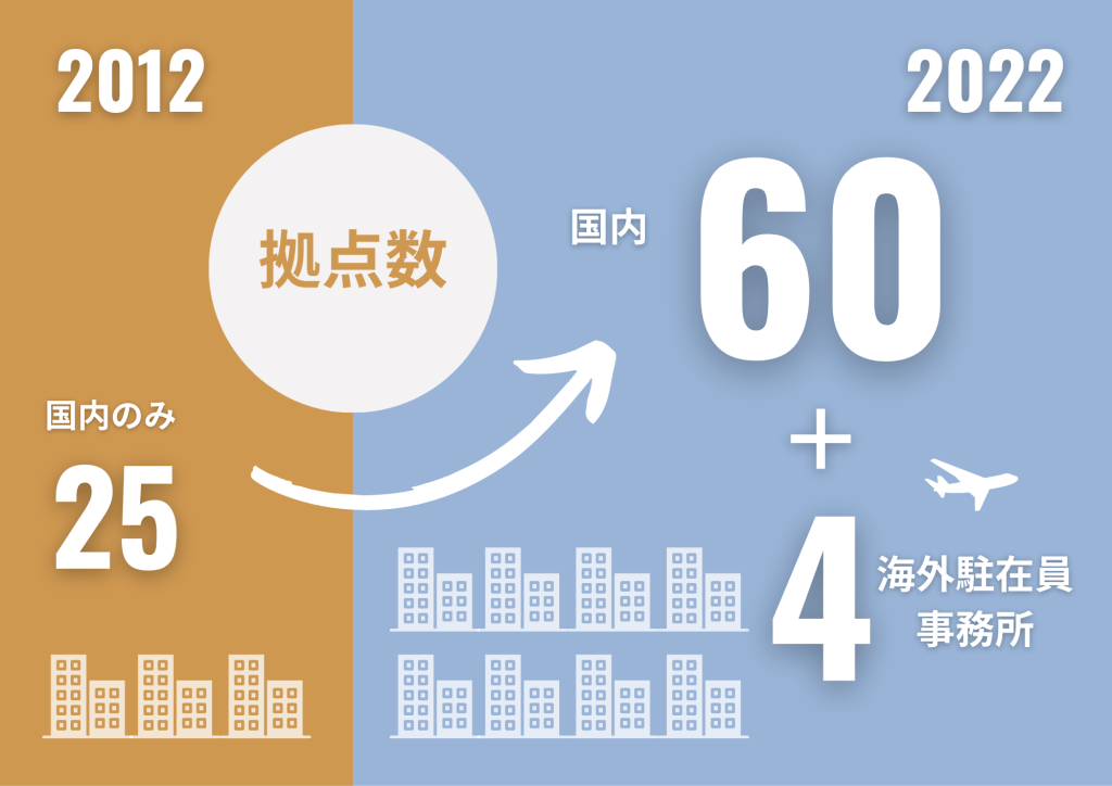 今回は、2012年10月と、2022年10月時点にスポットを当て、直近10年間の「社員数」、「拠点数」、「女性管理職の数」を比較してみました