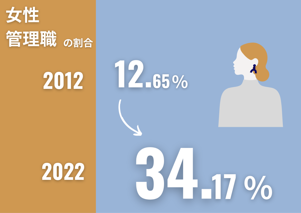 女性の目覚ましい活躍にも注目です。この10年で女性管理職の数は34%にまで増えました。3人に1人は女性の管理職ということです。