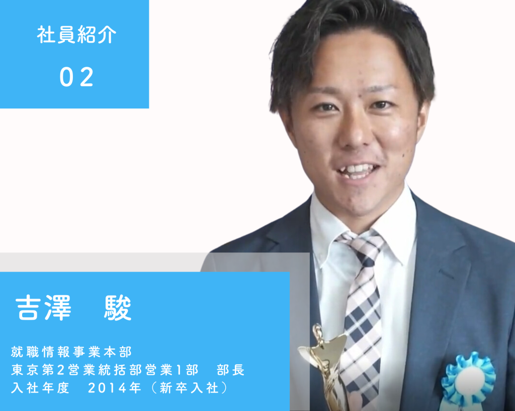 お二人目は、2014年入社の吉澤俊さんです!新卒から一貫して就職事業本部に在籍。トップセールスとして売上に貢献し続け、現在は部長としてご活躍されています。