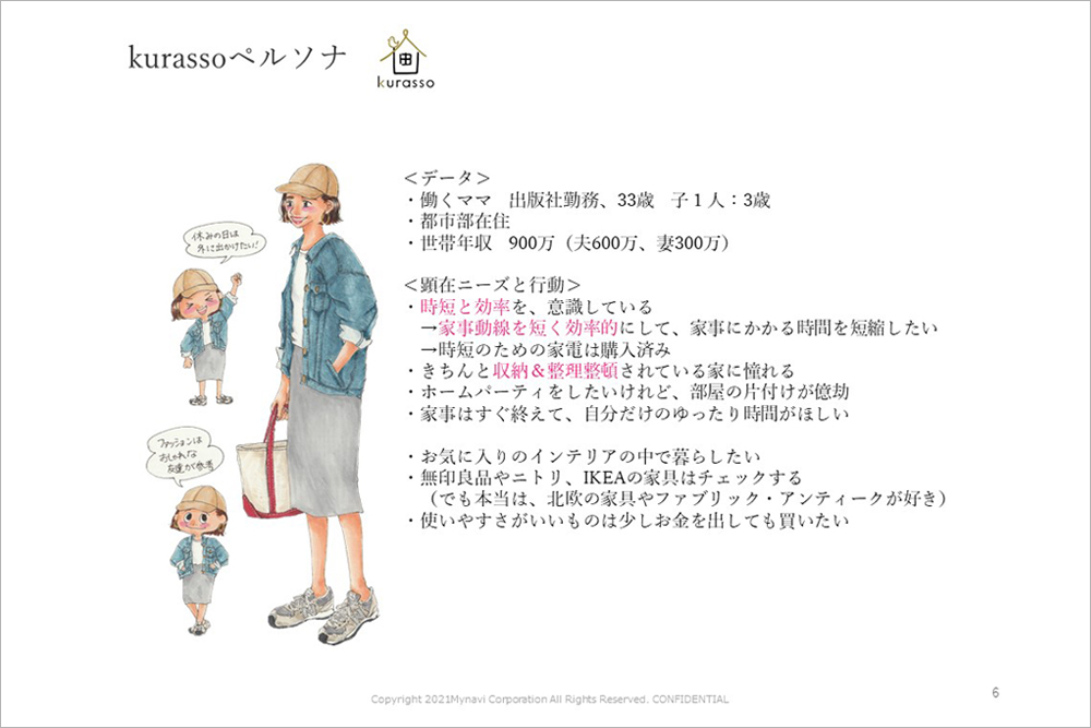 kurassoのペルソナは、33歳女性、働くママだそうです。時短や効率を意識し、きちんと収納&整理整頓されている家に憧れ、ホームパーティをしたいけれど、部屋の片付けが億劫・・・。