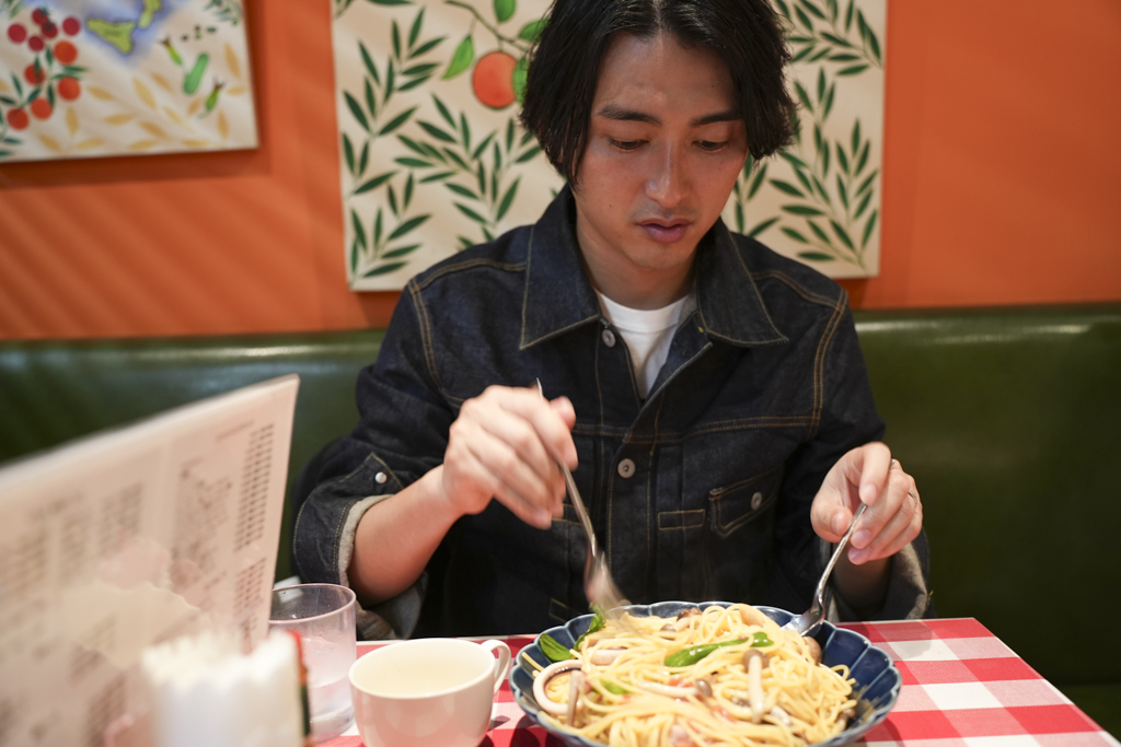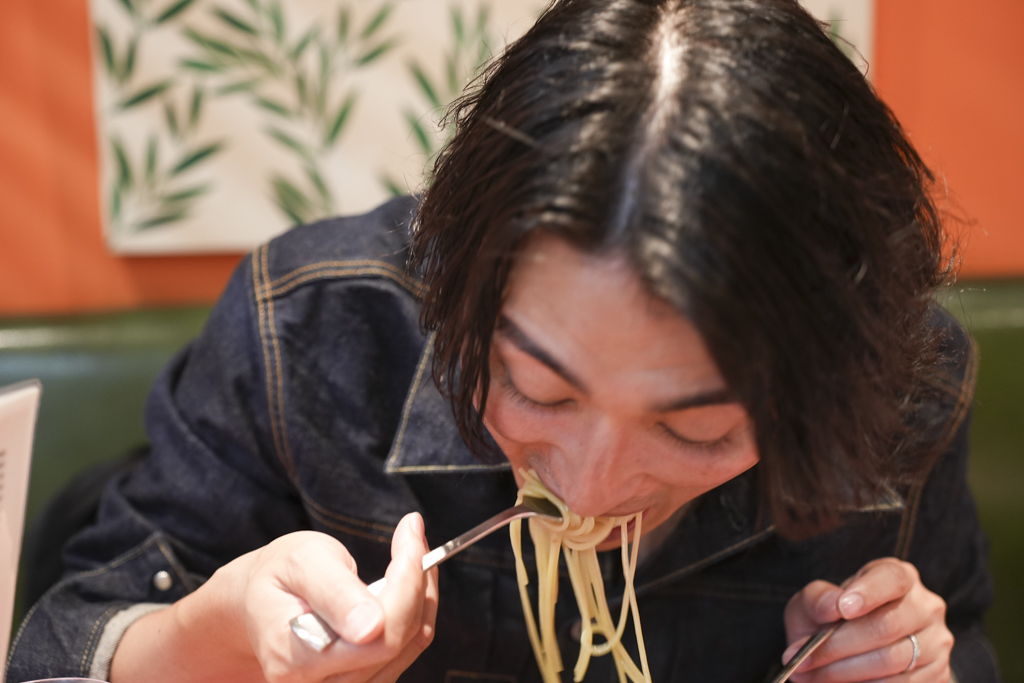 荒金さんは大盛りを注文。パスタが運ばれてくると、待ち切れないのか速攻でフォークですくって食べ始めました。