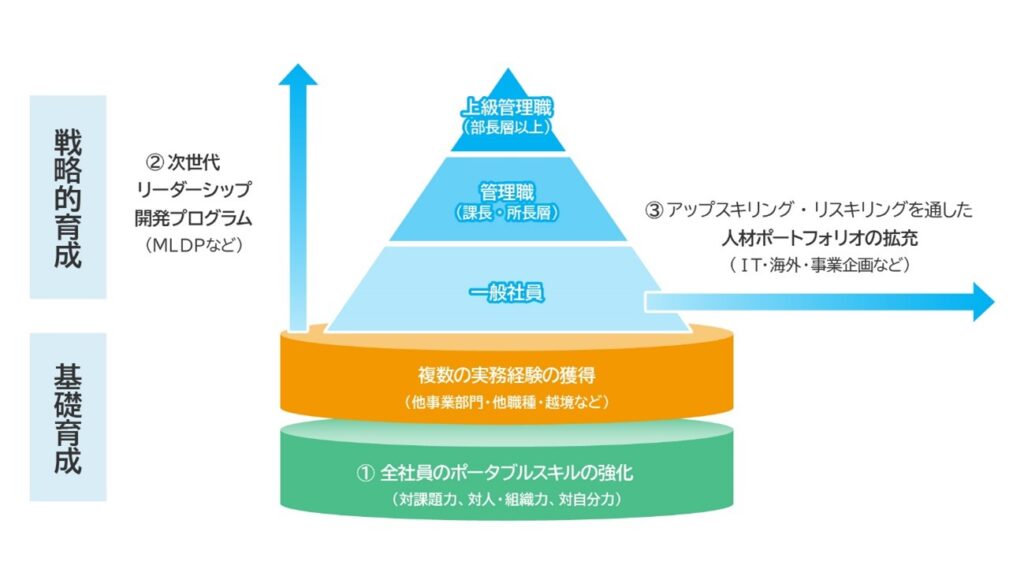 具体的には「ポータブルスキルの強化」「次世代リーダーシップ開発プログラム」「リスキリング・アップスキリング」の3つを重要な軸として取り組みを展開しています。