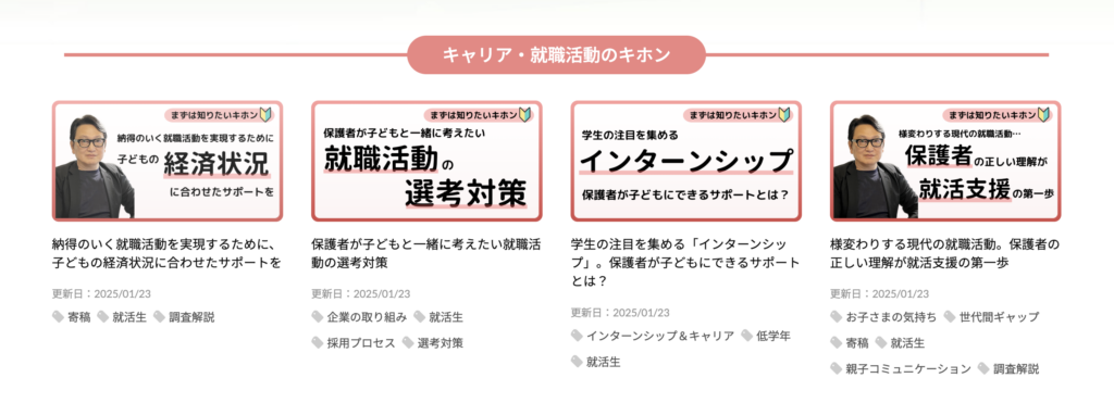 保護者のためのコラム:旬の情報を取り上げたコラムや大学教授へのインタビュー記事などを掲載