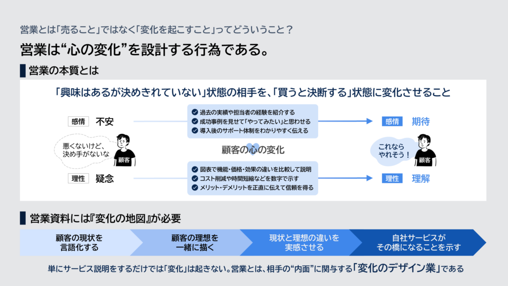 ー耳が痛いですね・・・。これを読んでいるアルムナイの皆さんが営業資料を向上するためにはまずは何を意識すれば良いと思いますか?