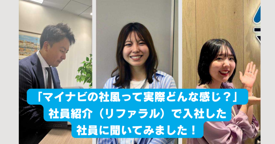 マイナビでは在籍社員の紹介で入社するリファラル(社員紹介)での入社が年々増えています。社員紹介を通じて入社した3名の方に、実際に働いてみて感じたマイナビの社風について聞いてみました!